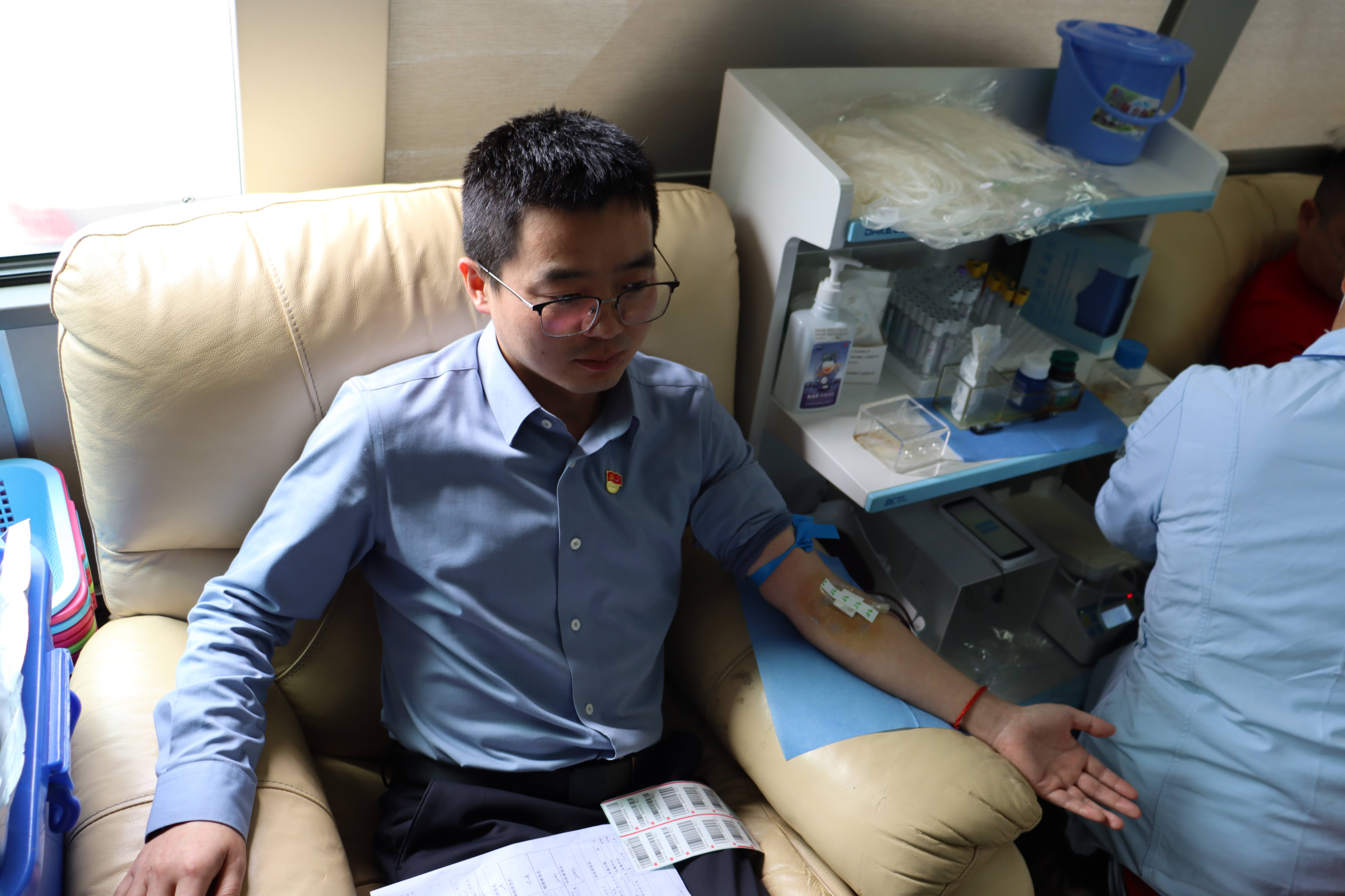 在献血活动现场,四川大件运输党支部的党员干部和职工志愿者们热情高涨,提前来到献血车前排队,在工作人员的引导下,有条不紊地完成信息登记、健康体检、血液化验等一系列献血前的准备流程。在这支献血队伍中,既有多次献血的老党员,也有首次献血的新同志。通过初筛后,他们都微笑着走向献血处,配合工作人员完成全部献血流程。据统计,当日共有7名干部职工,成功献血2200毫升。